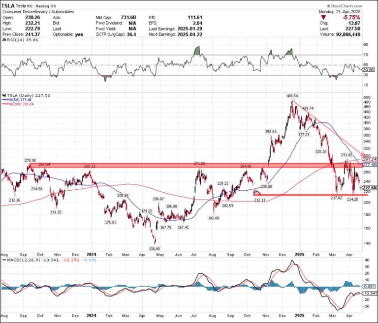 The sell-off reached a crescendo after “Liberation Day” and snapped back to levels that set up a plan of attack as we go into this week’s earnings. Shares reached extreme oversold conditions on both the MACD and RSI readings before hitting recent lows. Price action on the biggest move lower showed a divergence in both indicators, and didn’t confirm that last move down.